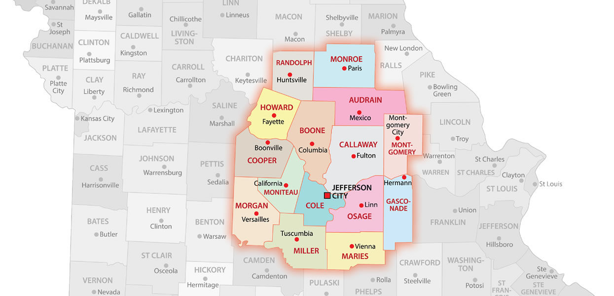 Boone, Cole, Audrain, Callaway, Cooper, Gasconade, Howard, Maries, Miller, Morgan, Moniteau, Monroe, Montgomery, Osage and Randolph.